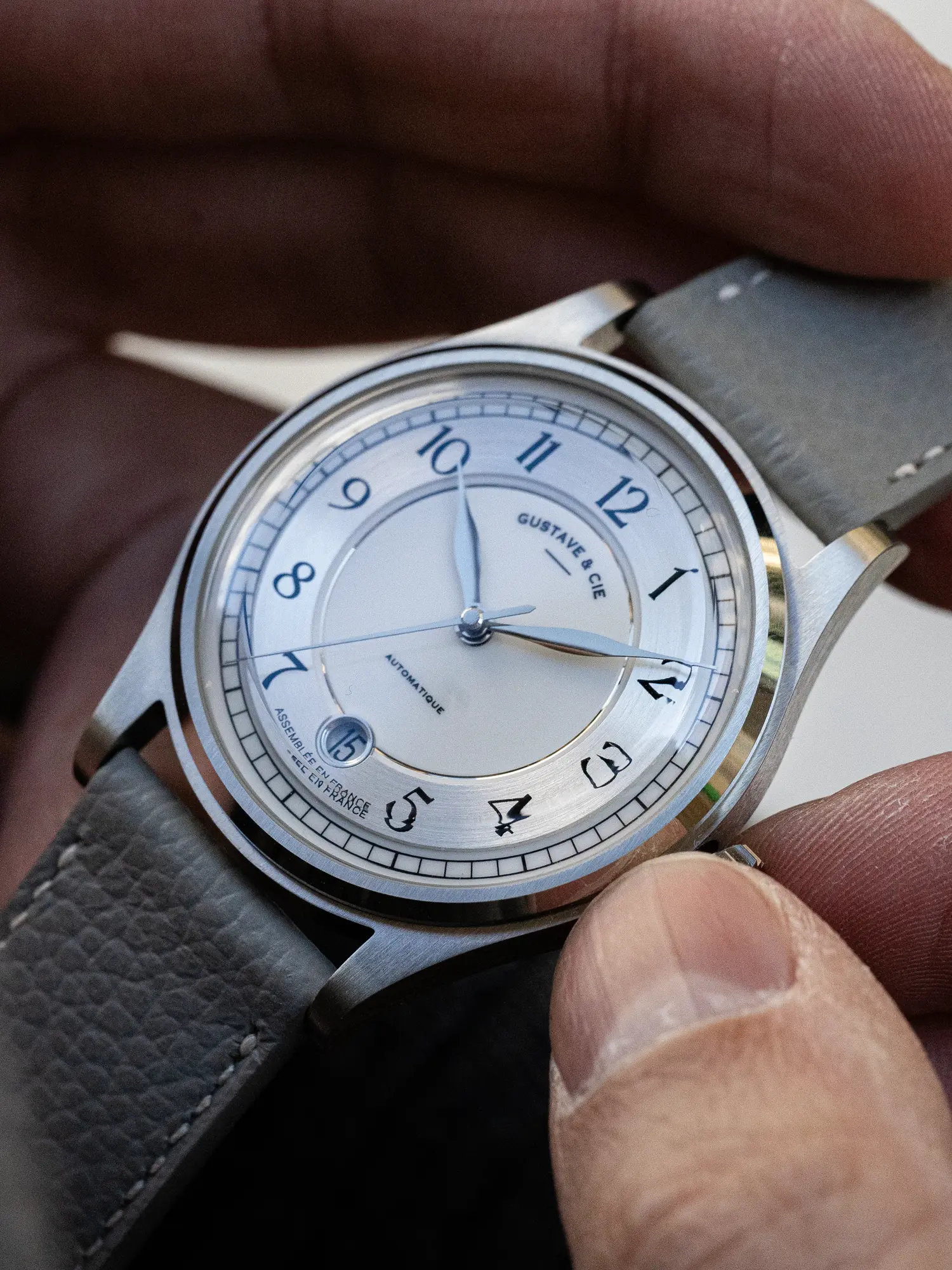 Notre premier modèle automatique trois aiguilles de 38 mm se distingue par son design lumineux. Son cadran blanc 12H, rehaussé d’un disque argenté brossé et d’index noirs, offre un contraste élégant. Les aiguilles argentées et la date discrète à 6H complètent ce modèle sobre et intemporel.