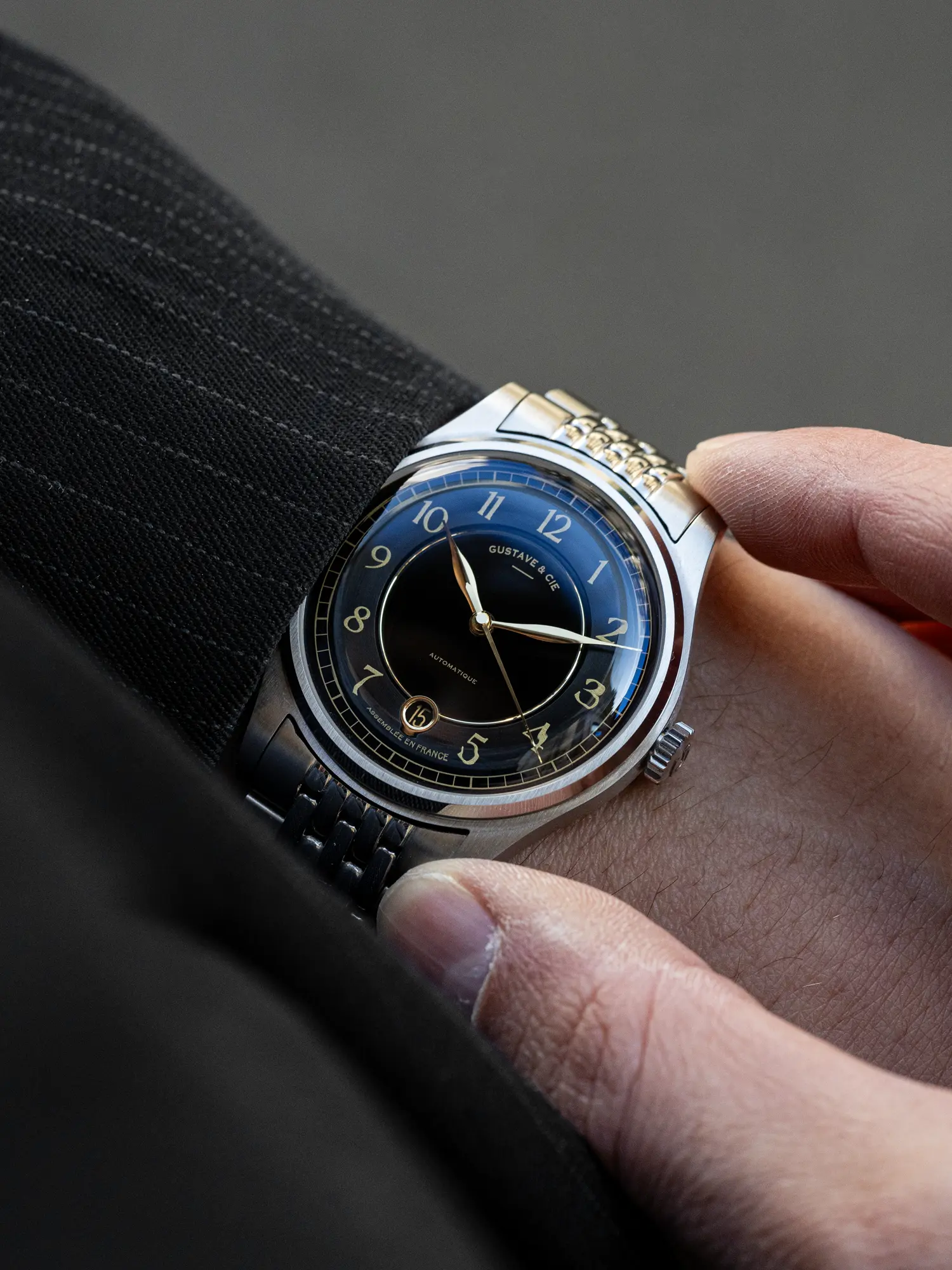 Avec son boîtier de 38 mm, cette montre automatique incarne l'élégance de notre maison horlogère. Son boîtier en acier inoxydable mêle finitions brossées et polies, tandis que son cadran noir 12H séduit par sa profondeur, avec un cercle brossé, des index bombés dorés et des aiguilles assorties. Une date à 6H complète ce modèle raffiné.