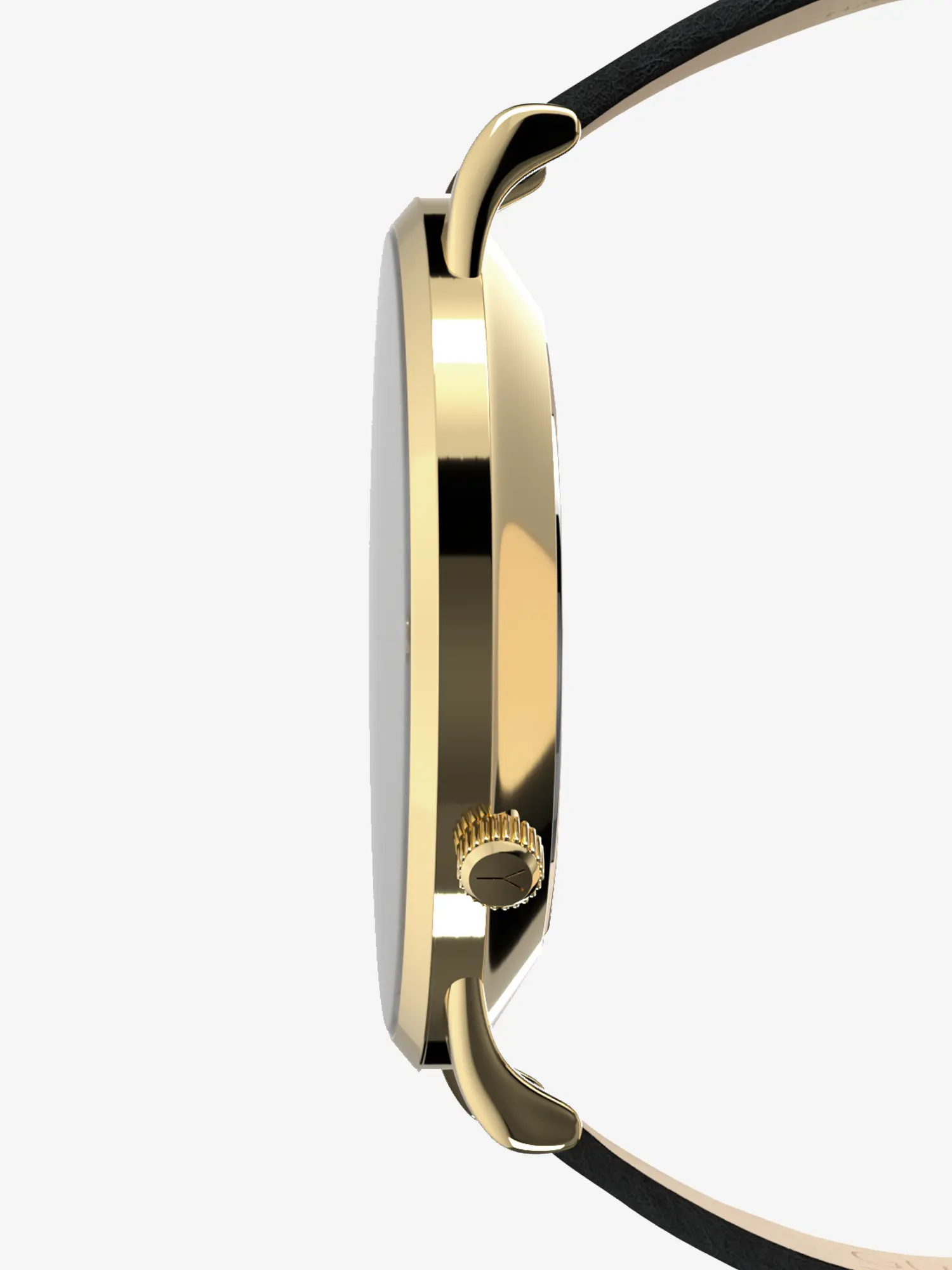 Disponible en 36 et 40 mm de diamètre, cette Georges arbore un cadran blanc texturé allié à un boîtier en acier inoxydable 316L avec un revêtement PVD Or. Le verre saphir est légèrement bombé.