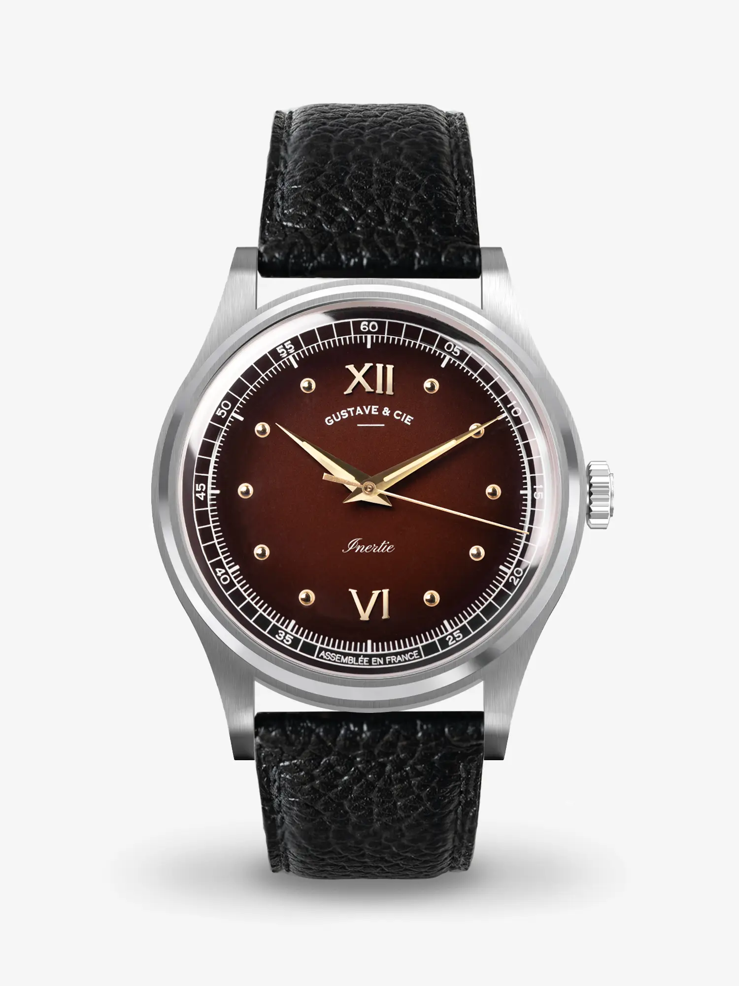 Avec son cadran laqué brun dégradé, la montre Léon révèle la profondeur du temps qui s’écoule. Les reflets chauds du marron se transforment au gré de la lumière, évoquant le mouvement lent et précis d’un pendule en équilibre.