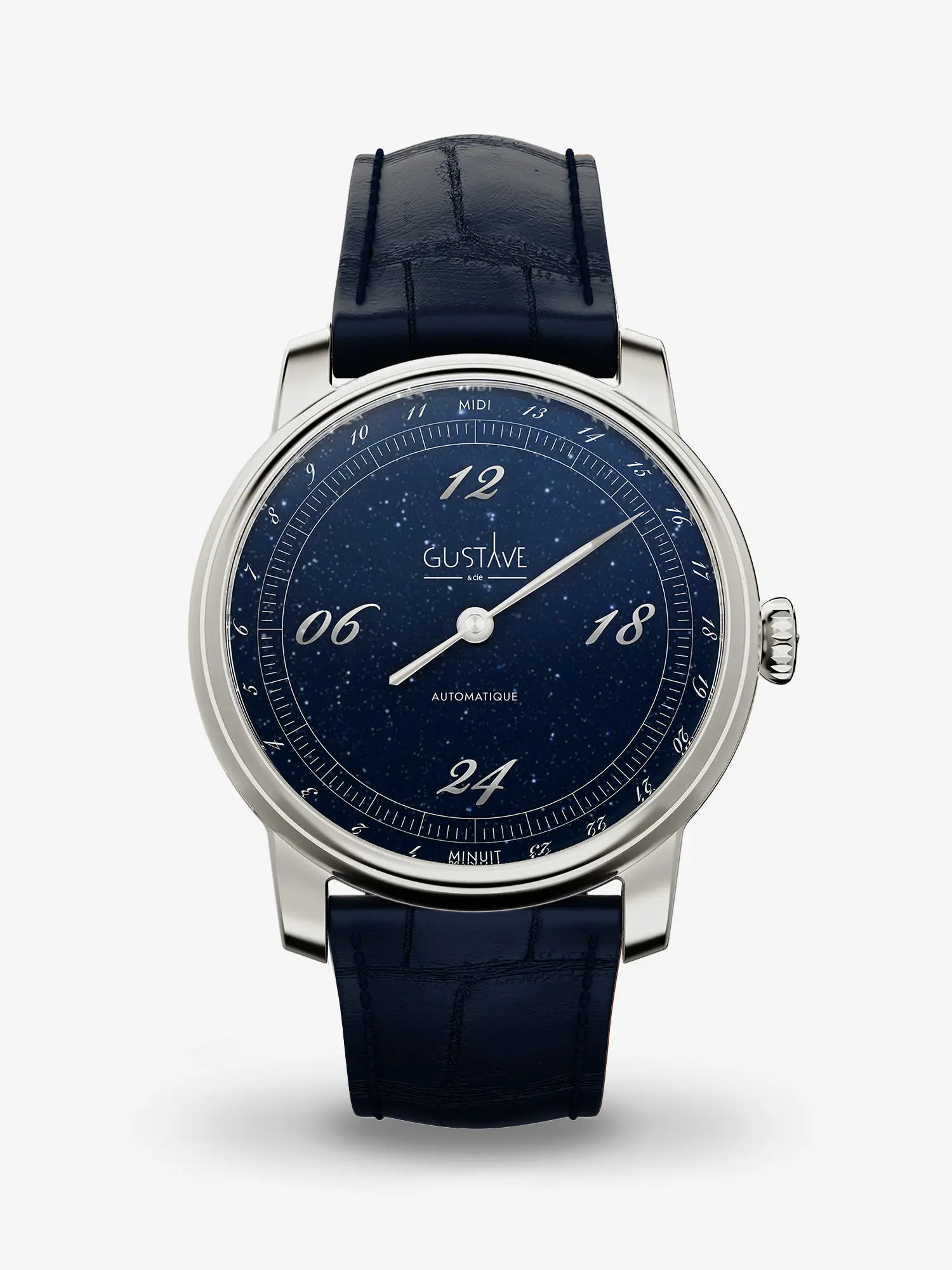 Cette montre automatique de 39 mm de diamètre est en acier inoxydable avec un revêtement, ce qui lui confère un profil harmonieux, alliant finesse et robustesse. Son cadran est conçu sur 24H et il est en aventurine bleu nuit. Ses index appliqués argent ainsi qu’une aiguille subtilement incurvée associent élégance et précision.