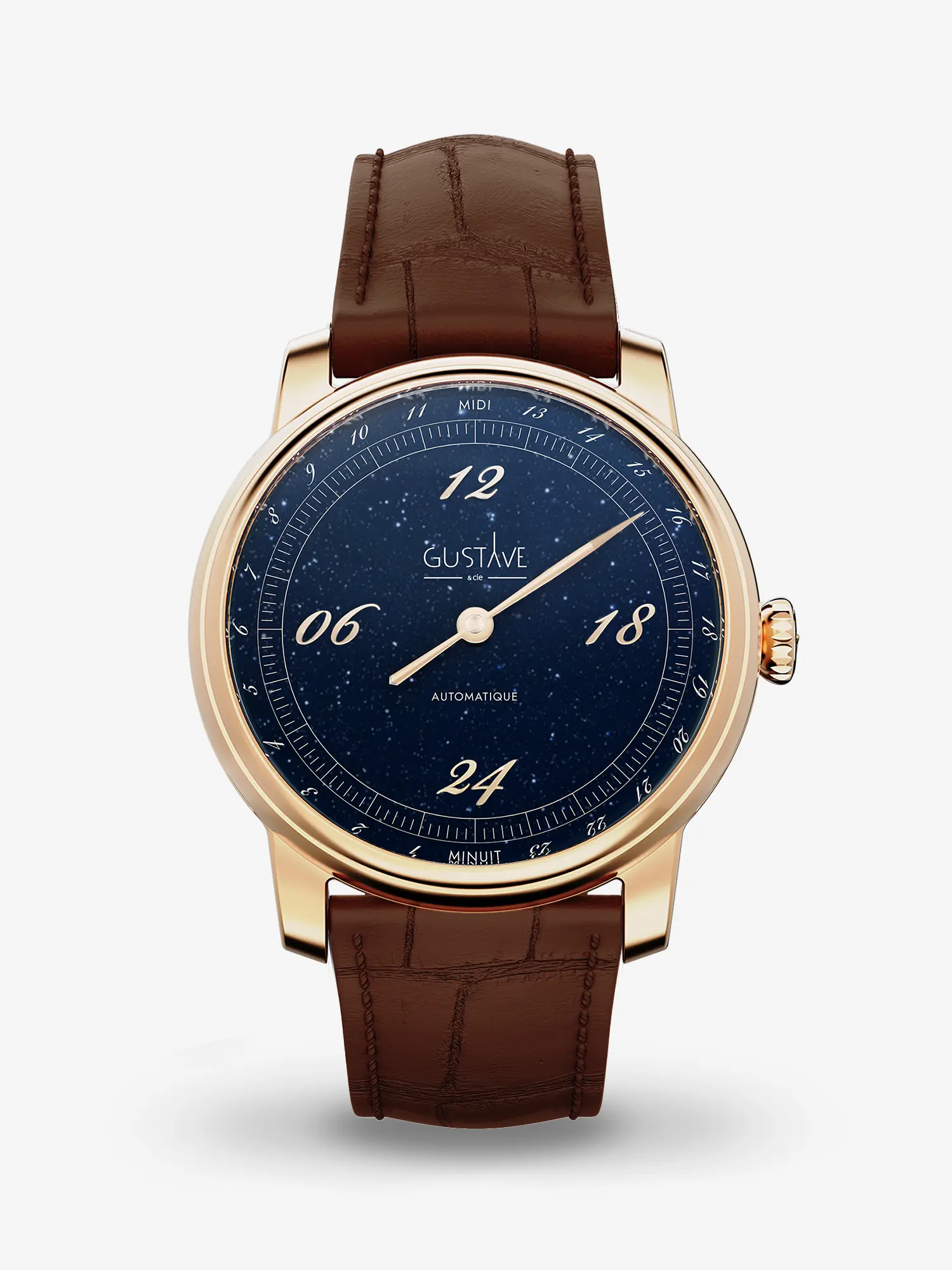Cette montre automatique de 39 mm de diamètre est en acier inoxydable avec un revêtement PVD or rose, ce qui lui confère un profil harmonieux, alliant finesse et robustesse. Son cadran est conçu sur 24H et il est en aventurine bleu nuit. Ses index appliqués or rose ainsi qu’une aiguille subtilement incurvée associent élégance et précision.
