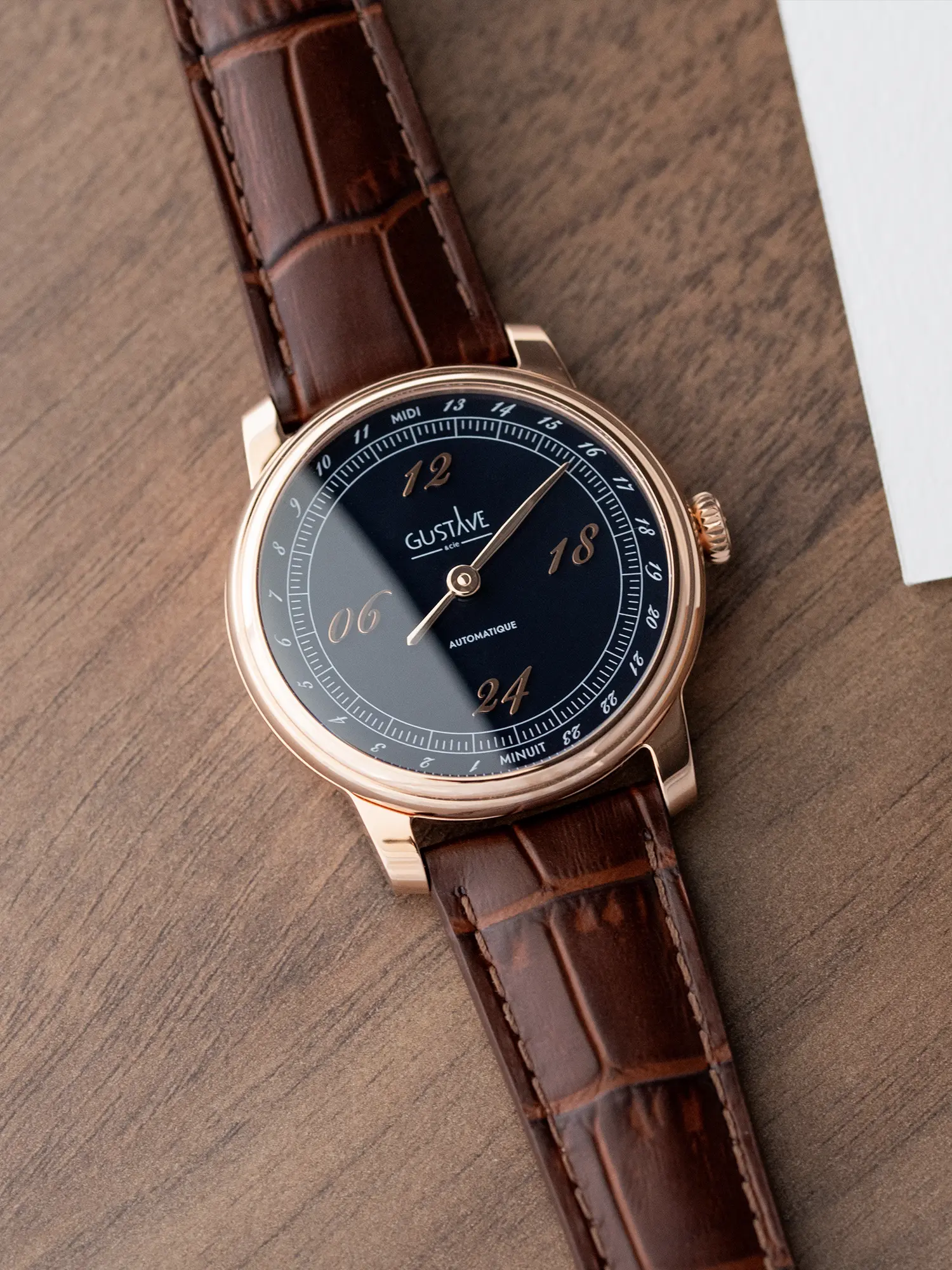 Cette montre automatique de 39 mm de diamètre est en acier inoxydable avec un revêtement PVD or rose, ce qui lui confère un profil harmonieux, alliant finesse et robustesse. Son cadran est conçu sur 24H et il est émaillé bleu nuit. Ses index appliqués or rose ainsi qu’une aiguille subtilement incurvée associent élégance et précision.